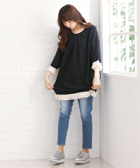 他のサイズは以下をご覧ください LL/3L はこちら 4L/5L/6L はこちらフリンジ使いプルオーバー ニッセン nissen 黒 ベージュ カラー 黒/ベージュ サイズ 8L/10L 素材 品質=[本体]ポリエステル100%(カットソー ミニ裏毛) [フリンジ部]綿100% 両脇スリット 原産国 中国製 メーカー品番 ZZY4319A3425 コメント みんな大好きドルマンプルオーバーにフリンジをプラス♪